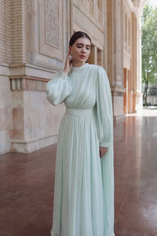 Haya Dress is an elegant and stunning piece for your next occasion with layered waves and gorgeous sleeve detailing.